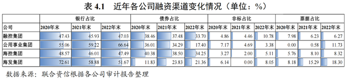 西海岸新区城投企业债务增速较快,融控集团和海控集团全部债务规模较大,截至2023年9月末,分别为1196.34亿元和925.82亿元。四大集团公司融资渠道以银行借款和发行债券为主,非标占比不高,整体融资结构尚可。