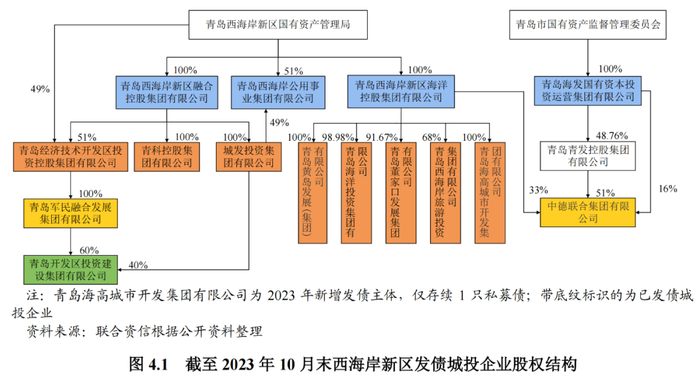 2018年11月,青岛市西海岸新区政府为了进行资源整合,布局新区的两大战略——军民融合战略和经略海洋战略,在新一轮国企改革背景下,组建了融控集团和海控集团两大控股集团。从股权结构来看,截至2023年10月末,西海岸新区内共存续15家发债城投企业,大致可以分为以融控集团和海控集团为母公司的两大集团,以及相对独立的青岛西海岸公用事业集团有限公司(以下简称“公用事业集团”)和青岛海发国有资本投资运营集团有限公司(以下简称“海发集团”)2家。