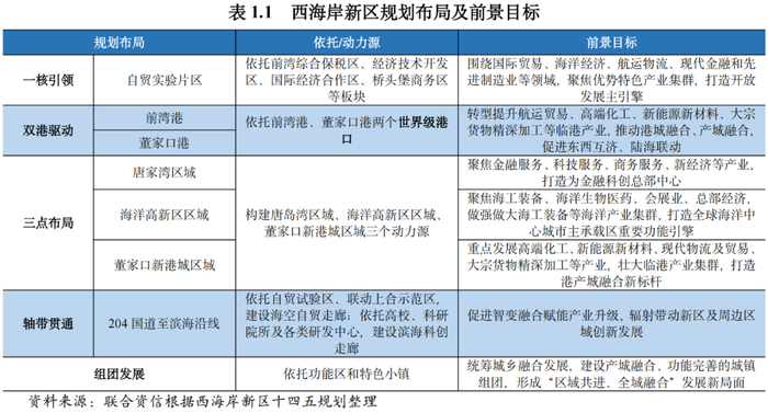 西海岸新区十四五规划提出重点构建“一核引领、双港驱动、三点布局、轴带贯通、组团发展”的空间布局。其中,“一核引领”是指以自贸试验片区为核心,依托前湾综合保税区、经济技术开发区、国际经济合作区、桥头堡商务区等板块;“双港驱动”是指以前湾港、董家口港两个世界级港口为依托;“三点布局”是指构建唐岛湾区域、海洋高新区区域、董家口新港城区域三个动力源;“轴带贯通”是指以204国道至滨海沿线为轴带;“组团发展”是指依托功能区和特色小镇,统筹城乡融合发展。