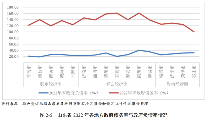 山东省各地级市政府债务余额及政府债务率均有所增长,政府债务率较高的地级市集中在省会经济圈,东营、滨州和德州政府债务率超过150%。