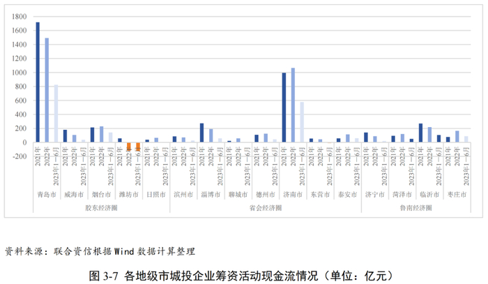短期偿债指标方面,2022年末山东省各地市发债城投企业货币资金对短期债务的覆盖倍数均小于1,大部分地市覆盖程度均呈不同程度的下降。2023年6月末,各地市发债城投企业货币资金对短期债务的覆盖倍数整体有所上升,其中潍坊市、淄博市和日照市货币资金对短期债务的覆盖倍数较低,存在较大的短期偿债压力。再融资方面,2022年及2023年上半年山东省各地市发债城投企业筹资活动现金流多表现为净流入。其中,潍坊市再融资环境有所波动,筹资活动现金由净流入转为净流出。