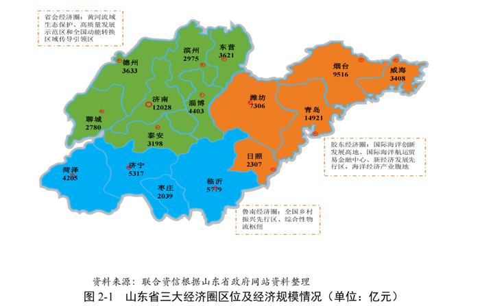 山东省核心城市济南和青岛经济实力远超其他地级市且人口虹吸效应强,胶东经济圈整体产业基础较好、区位优势明显,省会经济圈中济南总部经济效应明显,但其他地级市经济实力表现普遍位于山东省中下游,鲁南经济圈主要地级市经济实力处于省内中游以上。