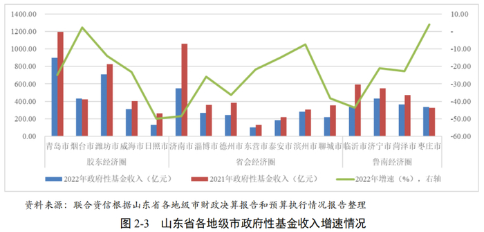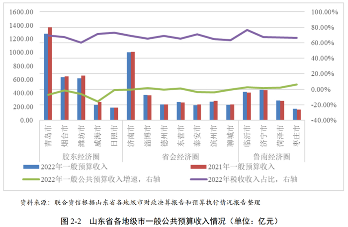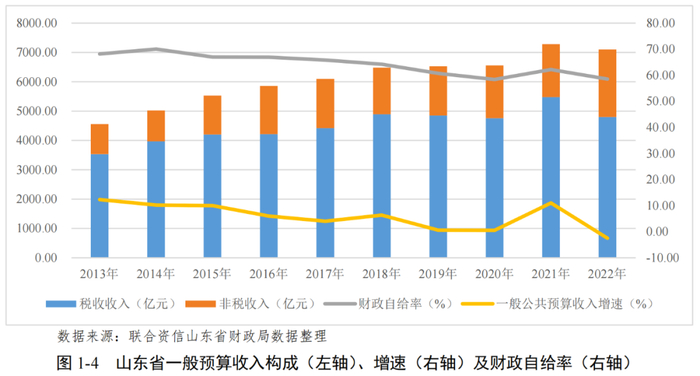 2022年,受宏观经济环境下行及减税降费力度较大影响,山东省大部分地级市一般公共预算收入有所下滑,规模分化明显,税收收入占一般公共预算收入的比重及财政自给率均有所下降,2023年上半年一般公共预算收入普遍有所回升。受房地产市场低迷影响,大部分地级市政府性基金收入下降明显且2023年影响持续。