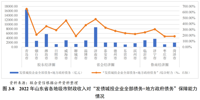 山东省大部分地级市的“发债城投企业全部债务+地方政府债务”/综合财力超过200%,其中青岛市、济南市和威海市指标表现较高。