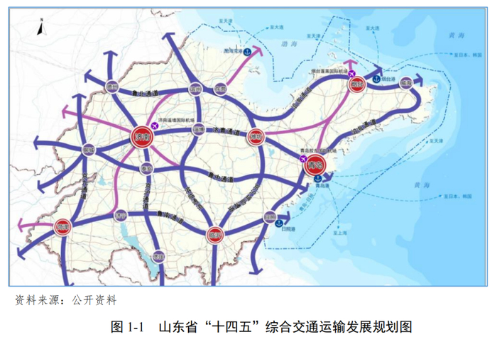 区位条件良好,陆路交通和水路交通较发达,港口优势明显。山东省地处我国胶东半岛,地形以平原丘陵为主,可承接京津冀及长三角经济辐射;山东省地跨淮河、黄河、海河、小清河和胶东五大水系,海洋面积15.96万平方公里,海洋资源丰富,区位条件良好。山东省建设了较为完善的水陆空综合交通运输体系,为港口强辐射省份。“四横五纵”综合运输大通道加快贯通,省内高铁成环运行。至2025年,山东省基本建成互联互通的基础设施主骨架,深化实现“市市通高铁、县县双高速、户户硬化路”,在巩固现有的“四横五纵”综合运输通道基础上推动“四横五纵沿黄达海”。
