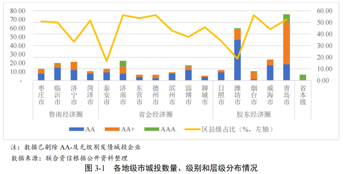 山东省发债城投企业主体信用级别以AA和AA+为主,高信用级别城投企业主要集中在青岛市和济南市。