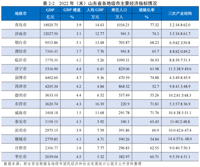 省会经济圈和胶东经济圈经济实力较强,核心城市济南和青岛经济规模处于领先水平,鲁南经济圈经济实力相对较弱。从各地级市经济总量上来看,济南市及青岛市GDP规模均超过万亿,分别为山东省GDP的17.06%和13.76%。省会经济圈中济南总部经济效应明显,产业体系完善,但其他地级市经济实力表现普遍位于山东省中下游。胶东经济圈中青岛区位优势显著,形成了港口物流、现代渔业、海水利用等特色经济为支撑的海洋经济产业,烟台及潍坊经济实力较强,且烟台2022年GDP增速居全省第一。鲁南经济圈中临沂、济宁及菏泽均位于中游以上水平,枣庄市GDP位于全省末位。2022年,山东省各地市GDP增速放缓,得益于经济恢复及产业结构持续优化等,2023年上半年各地市GDP增速有所回升。