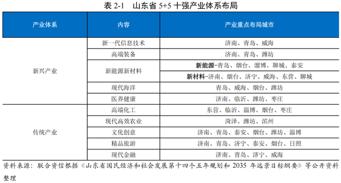 省会经济圈和胶东经济圈产业基础较好。从产业分布来看,山东省各地级市依托自身资源优势等发展相关产业,拥有1个国家级新区,29个国家级高新区/经开区以及A股上市公司306家。山东省各地级市针对“5+5”十强现代优势产业体系进行布局,其中青岛、济南及烟台市受益于本身产业基础及交通枢纽优势,其产业集群相对更为丰富。