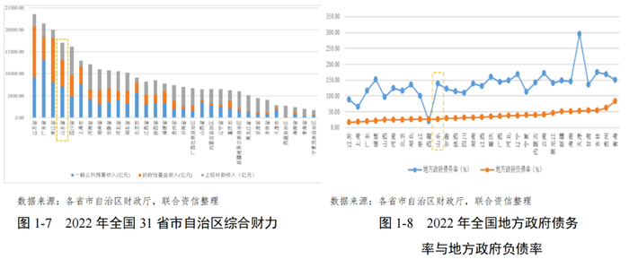 山东省整体政府债务负担处于全国中游水平。2022年,山东省地方政府负债率(地方政府债务余额/GDP*100%)和债务率(地方政府债务余额/综合财力*100%)分别为26.98%和144.17%。