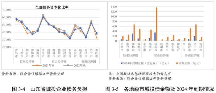 截至2022年末,青岛市发债城投企业全部债务规模超万亿,济南市、潍坊市、济宁市、威海市、淄博市、临沂市和泰安市发债城投企业全部债务规模均超过千亿,其余各地市发债城投企业全部债务规模在千亿以下。债务负担方面,截至2022年末,山东省发债城投企业全部债务资本化比率整体有所上升,青岛市、济南市、济宁市、淄博市和日照市发债城投企业全部债务资本化比率超过50%,债务负担相对较重。债券集中兑付方面,2024年,山东省发债城投企业(不含省本级)到期债券(在考虑行权的情况下)规模为805.13亿元,其中济宁市和潍坊市2024年到期规模较大。