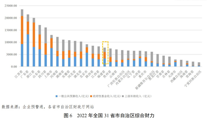 综合财力有所下降,规模排名全国中游。2022年,福建省综合财力较上年末下降6.46%,在全国31个省市自治区中排名第15位,居于全国中游。福建省上级补助规模较小,综合财力高于福建省的省市自治区中,仅有北京市和上海市的上级补助收入规模小于福建省。