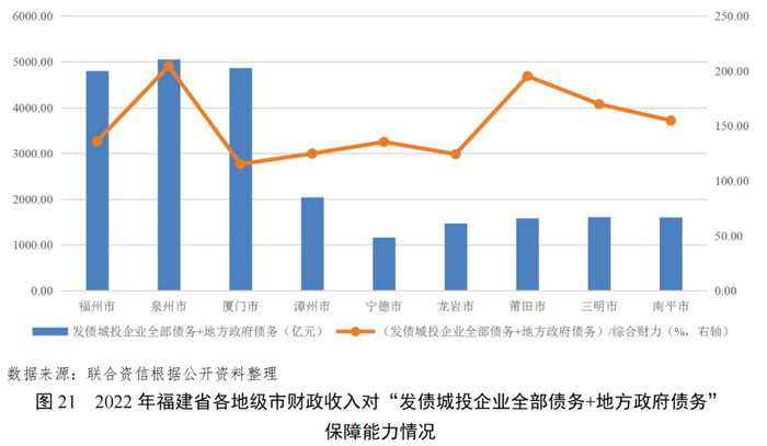 福建省各地级市(发债城企业全部债务+地方政府债务)/综合财力中泉州市最高,超过200%。各地级市综合财力对“发债城投企业全部债务+地方政府债务”支持保障能力处于合理水平。