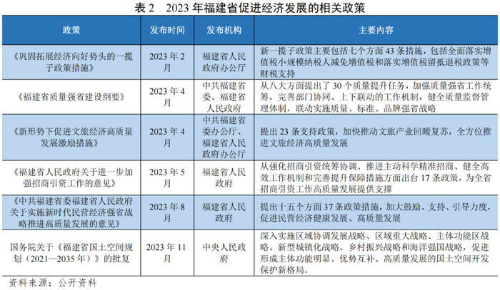 福州都市圈[1]建设持续推进,都市圈内协同发展基础设施和产业等领域,深化都市圈与台湾地区在重点产业领域融合发展。海洋经济高质量发展是持续拉动福建省经济增长的重要动力,同时海上丝绸之路核心区建设持续推进对外产业、贸易、投资合作。2023年福建省发布一系列细化精准政策,以推动重点产业增长,激发市场经济活力。