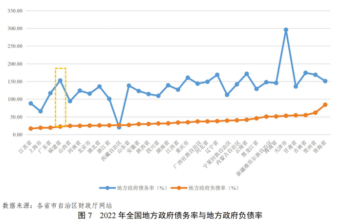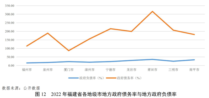 债务负担处于全国中上游水平。2022年,福建省地方政府债务率(地方政府债务余额/综合财力*100%)和地方政府负债率(地方政府债务余额/GDP*100%)分别为152.68%和22.41%,在31省中分别排名第25和第4(按照从低到高排序)。