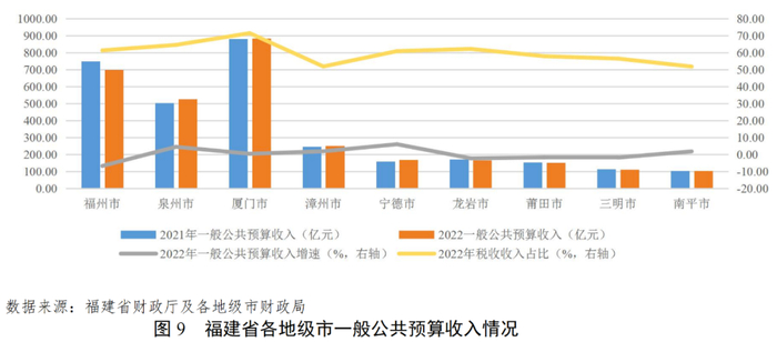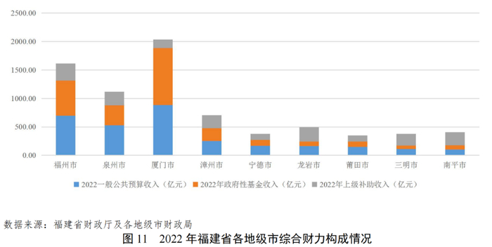 各地级市一般公共预算收入整体变化不大,厦门市、福州市和泉州市收入规模远超其他地级市。受经济下行和留抵退税等因素影响,税收收入占一般公共预算收入的比重均有所下降,财政自给率整体小幅下降,其中厦门市税收收入占比和财政自给率维持较高水平。