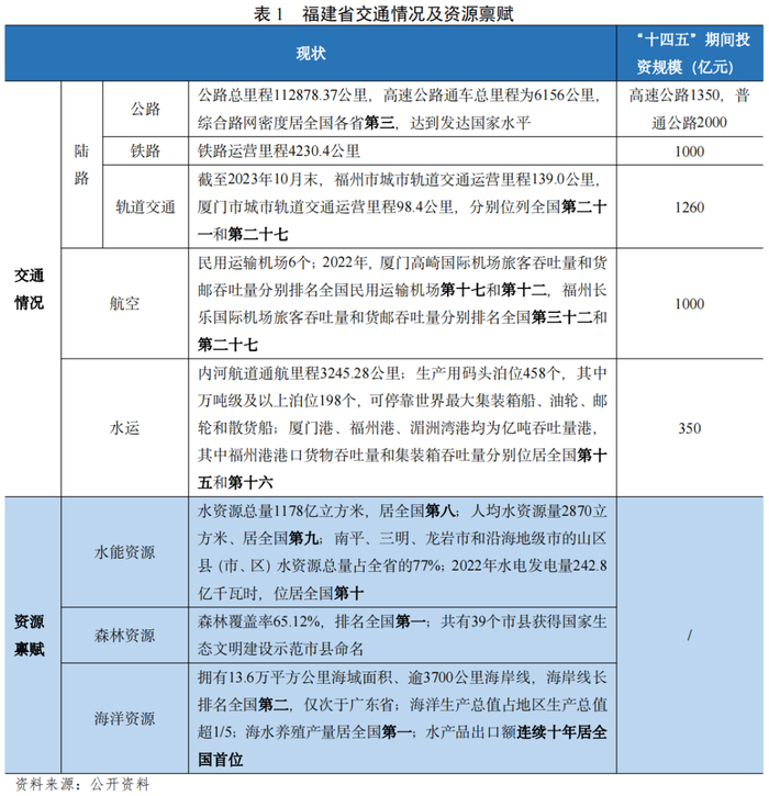 福建省位于中国东南部沿海,作为我国对外开放和文化交流的重要窗口,是台胞台企登陆的第一家园,是“海上丝绸之路”的起点。福建省森林及海洋资源丰富,交通通达性良好,“十四五”期间福建省综合交通建设将完成投资8300亿元以上,重点投资于公路项目(投资达3350亿元)。