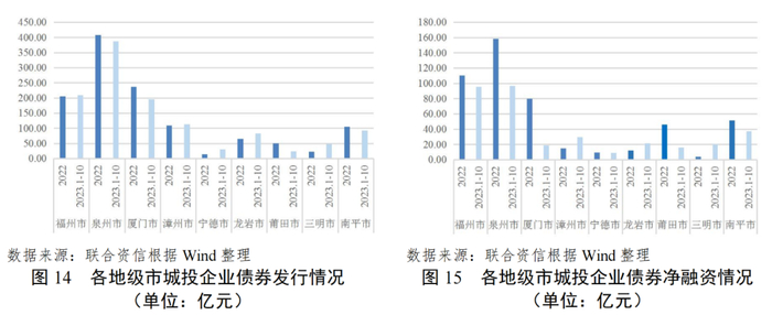 2023年1-10月,福州市、龙岩市、宁德市、三明市和漳州市新发行债券规模超过上年全年。各地级市净融资均为净融入,福州市和泉州市合计净融资额占福建省比重超50%。