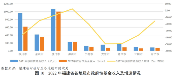 受房地产行业深度调整影响,福建省大部分地级市政府性基金收入有所下降,漳州市实现小幅增长。福建省各地级市政府性基金收入规模分化明显,厦门市和福州市政府性基金收入规模大,合计占福建省政府性基金收入的62.10%。受房地产行业深度调整影响,2022年福建省大部分地级市政府性基金收入规模有所下降,降幅主要在15%以上,但漳州市实现2.4%的增幅。2023年1-6月,各地级市政府性基金收入整体呈现下降趋势,部分地级市降幅明显,龙岩市和宁德市分别同比下降45.5%和39.7%。