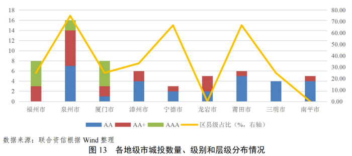 泉州市为发债城投企业最多的地区,发债城投企业主体信用级别以AA和AA+为主,高信用级别城投企业主要集中在福州市、厦门市和泉州市。