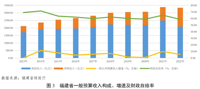 2022年,福建省一般公共预算收入为3339.21亿元,全国排名第12位,同口径增长5.5%;税收占比下降至62.66%,一般公共预算稳定性仍较高;财政自给率58.67%,财政自给程度一般。2023年1-6月,福建省一般公共预算收入2182.53亿元,同口径增长11.4%。