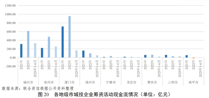 短期偿债能力方面,2022年末福建省各地级市发债城投企业货币资金对短期债务的覆盖倍数均小于1,2023年6月末漳州市存在一定的短期偿债压力。再融资方面,除南平市外,2022年及2023年上半年福建省各地级市发债城投企业筹资活动现金流整体表现均为净流入。其中,厦门市筹资活动现金流入量规模最大,突破900亿元。