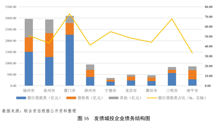 福州市、泉州市和厦门市发债城投企业债务负担相对较重,南平市发债城投企业债券类融资占比较高,福州市和漳州市城投企业的非标等其他融资占比较高,且存在一定的短期偿债压力。