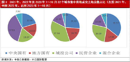 从企业性质来看,根据中指云数据库数据,2021~2022年,在22个试点城市中城投企业在各类型企业中拿地金额占比明显增加。其中,2021年民营企业拿地金额所占比重最大为37.93%;2022民营企业拿地金额所占比重大幅减少,同比减少24.42%,城投企业拿地金额所占比重最大为37.58%;2023年1~10月城投企业为除中央国有企业外拿地金额占比最多的企业。从城投企业溢价率来看,2021年77.70%的城投企业溢价率为0,2022年则扩大至79.68%。