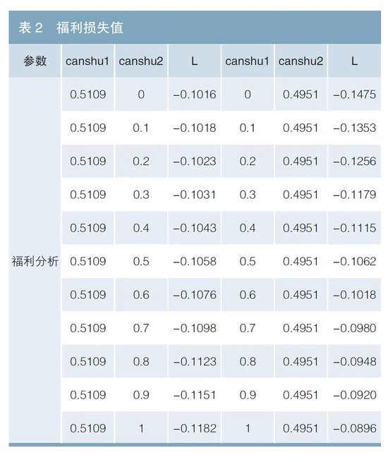 如表2所示,固定canshu1在后验均值,canshu2从0.1增加到0.2,社会福利损失值的绝对值增加0.0005;固定canshu2在后验均值,canshu1从0.1增加到0.2,社会福利损失值的绝对值减小0.0097。因此,当canshu1、canshu2同时从0.1增加到0.2时,社会福利损失值的绝对值总体表现为减小0.0092,方向、大小均与canshu1的变动一致,此特征具有普遍性。canshu1、canshu2同向变动相同的幅度时,canshu1变动的影响较大,能够完全覆盖canshu2带来的反向影响,canshu1的变动主导福利损失的变动方向及大小。