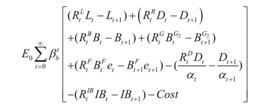 代表性金融机构在成本约束下通过选择贷款量、债券购买量、同业拆借量、储备量、外债购买量来实现利润最大化,可解得包括存款利率决定方程在内的金融机构最优行为方程组。