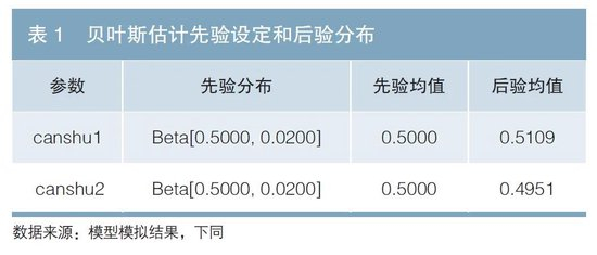 本文重点关注存款利率决定方程中对参考基准国债收益率、LPR赋予的权重系数,参考标准文献做法,将canshu1、canshu2设定为先验均值为0.5的贝塔分布,在此基础上估算两参数的后验均值。其他参数先验均值的设定,采用相关文献的校准值,并使用我国实际数据进行测算调整,同时根据稳态条件下各参数之间的等式关系,确定各参数之间的勾稽关系。