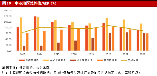 部分中亚国家政局稳定性有所承压,地区外债偿付风险总体较高。2022-2023年,哈萨克斯坦、乌兹别克斯坦和土库曼斯坦基本已通过选举实现第一代领导核心向第二代领导核心的平稳交接,塔吉克斯坦也采取措施为政权平稳交接铺路,政局整体稳定。但吉尔吉斯斯坦经济基础缺乏以及政党制度的不健全导致其政治转型进程反复,政局长期处于动荡之中。同时,地缘局势紧张以及国内社会骚乱事件使中亚政局稳定性有所承压。受部分社会支出增加影响,中亚地区财政赤字将有所扩大,估计2023年中亚财政赤字率加权平均为1.2%。中亚地区政府债务负担率整体处于较低水平,2022年,中亚地区各级政府债务负担率加权平均值为23.7%,但是吉尔吉斯斯坦由于财政赤字率长期处于较高水平以及货币贬值因素影响,政府债务负担率处于区域最高水平,2022年政府债务负担率为52.0%。由于中亚地区金融发展水平较低,偿债来源对双边官方贷款以及多边组织机构优惠贷款较为依赖,同时外债水平较高,使其本外币偿付能力均处于较低水平。一方面,吉尔吉斯斯坦、塔吉克斯坦和乌兹别克斯坦对外部援助贷款较为依赖,分别占其政府外债的约70%、80%和85%左右。但哈萨克斯坦、乌兹别克斯坦以及土库曼斯坦依靠能源出口积累的主权财富基金,可以对债务偿付形成一定补充。另一方面,中亚地区对外筹措国家建设资金导致其外债规模长期处于高水平,2022年中亚地区加权平均外债负债率处于69.4%的高水平。同时,由于中亚地区出口竞争力较弱,经常项目常年处于逆差状态,加之较大的本币贬值压力,外汇储备相对不足。2022年,中亚地区国际储备与GDP之比加权平均为23.6%,相比69.4%的外债负债率处于明显不足状态。综上所述,中亚地区本外币偿债能力处于较低水平。