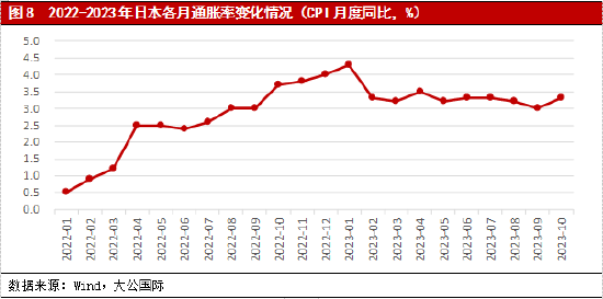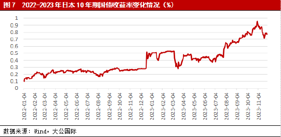 日本央行继续放宽收益率曲线控制政策,短期内央行负利率政策也可能面临转向,融资成本的上升或将导致政府部门偿债压力进一步增加,并推升主权债务风险。2023年7月28日,日本央行在货币政策会议中表示央行将以1.0%的固定利率购买国债且不设定购买上限,并允许日本10年期国债收益率在±0.5%的范围内进行波动,但在市场操作中仅将上述目标区间上下限作为参考,而不再作为刚性限制。日本央行此举进一步增加了收益率曲线控制政策(Yield Curve Control,YCC)的灵活性,在该项决议公布后一周之内日本10年期国债收益率由0.443%迅速上升21.1个基点至0.654%,上升幅度高达47.6%,同时2023年前11个月日本10年期国债收益率均值已达0.56%左右,较2022年0.24%的年均水平上升了一倍以上。与此同时,截至2023年10月日本国内通胀率已经连续19个月高于2.0%的目标水平,这是自1992年以来日本首次出现国内通胀率连续1.5年保持在2.0%以上。目前日本全国劳动组织联合会已计划在2024年春季的工资谈判中要求超过5.0%的加薪,其中最大的工业工会UA Zensen甚至寻求6.0%的工资涨幅,这意味着日本的工资-物价螺旋式通货膨胀在短期内很可能将持续,并使日本央行自2016年以来的短期负利率政策面临转向的压力。2022年末日本政府债务负担率已高达260.1%左右,融资成本的微幅增加都会使日本政府面临巨额的利息偿付压力。目前日本央行持有政府未偿债务占比高达43.1%,一旦央行结束短期负利率政策,并叠加国债收益率的上升,日本政府偿债压力或将进一步增加,并推升主权债务风险。