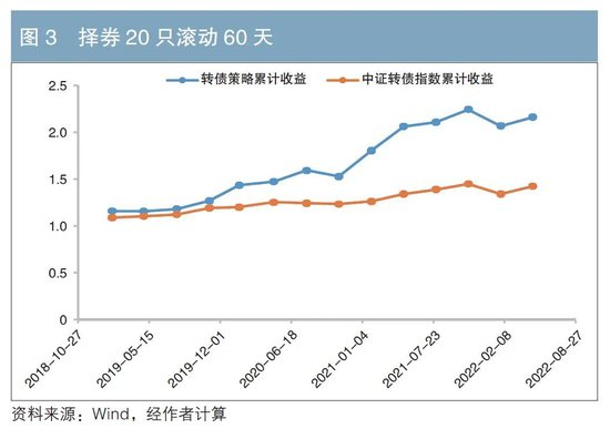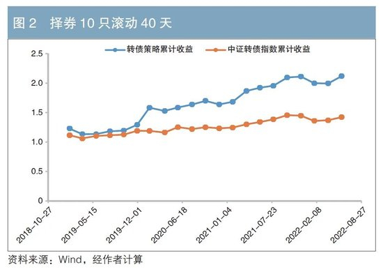通过对比发现,对于调仓时间间隔较短的调仓策略来说,B-S定价方式所取得的收益率略优于LSM定价方式,在回撤控制方面,LSM定价方式优于B-S。当调仓时间加长之后,LSM定价方式的累计收益率与回撤控制情况均优于B-S定价方式。综合来看,LSM定价方式优于B-S定价方式,原因可能是加入条款的约束后,定价结果得到修正,使得最后的结果更加平滑。图2、图3展示了LSM定价方式滚动40天、择券10只的结果与滚动60天、择券20只的结果,时间区间为2019年1月至2022年7月。在该区间,中证转债指数整体处于上行趋势中。