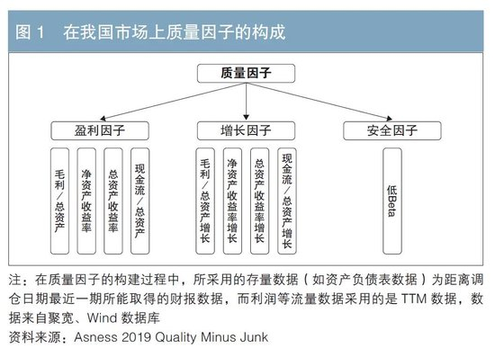 关于质量因子的构建,主要基于Asness(2019)提出的质量减去垃圾(Quality minus Junk,QMJ)因子,Asness将质量因子拆分为盈利、增长、安全3个维度,将方法在多个国际市场上进行检验并发现有效。本文将原质量因子的各个子因子在我国债券市场进行数据回测(回测时间为2019年1月至2022年7月),发现其中4个子因子显示无效,其余9个子因子相对有效,最终合成的质量因子如图1所示。
