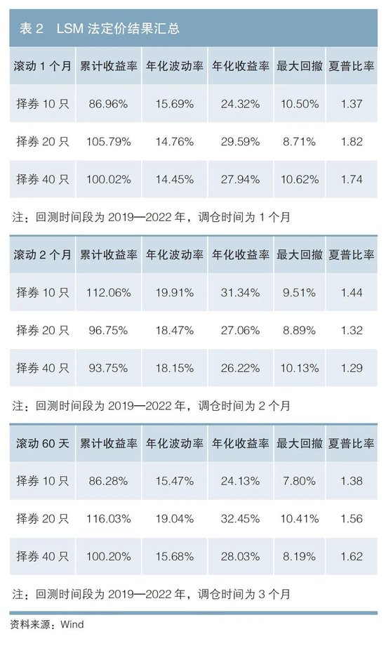 采用LSM法求得的定价因子与质量因子、溢价率因子合并得到复合因子,利用复合因子进行择券,回测得到的结果如表2所示。