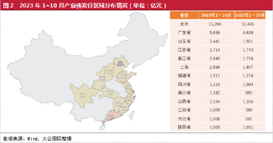 2023年1~10月,产业债融资规模超千亿元的省市有13个,包括北京、广东、山东、江苏、浙江、上海等经济发达省市。其中,北京融资规模继续扩大,2023年1~10月融资规模高达15,204亿元,同比增长21.97%,净流出规模同比大幅增加;广东融资规模同比由净流入转为净流出;山东融资规模继续净流入,且净流入规模同比有所增加;江苏和浙江融资规模表现为净流入,但净流入规模同比均大幅减少。