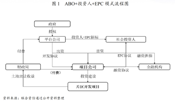 ABO+投资人+EPC模式是一种国有平台公司与社会资本进行合作的模式,政府通过直接授权或以竞争性方式确定平台公司,平台公司发起片区开发项目,然后公开选择投资人成立合资项目公司。项目公司在社会投资人的协助下筹措项目建设资金,负责片区开发项目的投资建设、运营管理。社会资本方一般拥有强大的综合实力,承担着主要的投融资任务,能够完成从项目设计、工程施工、产业导入、招商运营等全项目周期的运作,实践中的中标方多为建筑类央企或联合体。