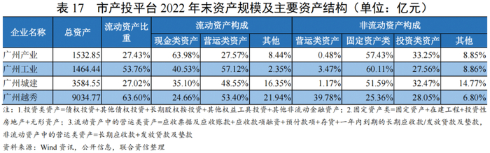 截至2022年底,市产投平台资产规模存在梯度,现金类资产整体较为充裕,资产结构存在差异。其中,由于能源和电力、水务、城市基础设施建设等积累的固定资产以及持有股权、债权等形成的投资类资产规模高,广州产业和广州城建的非流动资产比重相对高;由于房地产开发产品以及发放贷款、融资租赁款形成的营运类资产(计入流动资产部分)规模高,广州越秀的流动资产比重相对高;由于业务分布于装备制造、汽车零部件制造、建材制造以及商贸流通行业,广州工业的资产结构较为均衡。