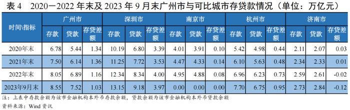 2020-2022年及2023年9月末,广州市金融机构本外币存款及贷款余额均持续增长,2022年末存款余额、贷款余额较上年末分别增加约5506亿元和7519亿元,存款及信贷规模持续扩大,始终高于可比省份的省会城市,低于深圳市(存款余额约为深圳同期末66%左右,贷款余额约为深圳市80%左右);存贷款差额始终高于1万亿元,明显高于可比省份的省会城市,仍低于深圳市,可用于对外提供信贷的存款资源相对丰富。