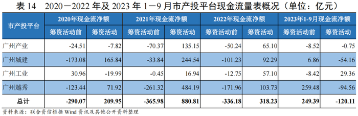 2020-2022年,市产投平台债券发行节奏呈现差异化走势,广州产业和广州工业本部及合并口径发行规模呈现不同程度的增长,广州越秀本部发行规模持续增长、合并口径发行规模呈现波动上升,广州城建呈现回落态势;整体看,市产投平台筹资活动现金流始终呈现净流入,净流入规模于2021年达峰后有所回落,广州越秀筹资活动前现金净流出额波动上升,其2021-2022年净流出额明显高于其他三家企业。2023年1-9月,市产投平台(合计)筹资活动前现金流大幅改善,尤以广州越秀筹资前净流入规模增长最为显著(其中经营获现较上年同期增加255.96亿元)。