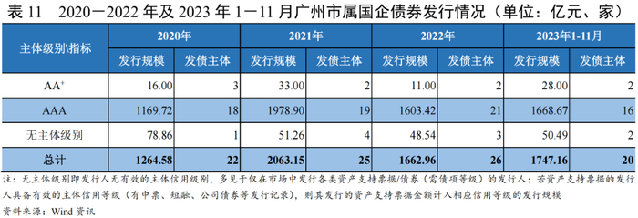 2020-2022年,广州市属国企债券发行规模波动增长(复合增长率为14.67%),三年变动趋势与全市债券发行趋势一致,但复合增长率高于全市债券增幅,其发行规模占全市25%~28%,主体信用等级以AAA为主;2023年1-11月,与全市发行规模低于上年的情况不同,市属国企发行规模较上年同期进一步增长17.59%,已超过2022年全年发行规模。其中,广州产业、广州地铁、广州交投和广州越秀发行规模相对高于其他企业[5],发行规模最大的两家——广州地铁和广州越秀2023年1-11月发行规模均已超过2022年全年水平。
