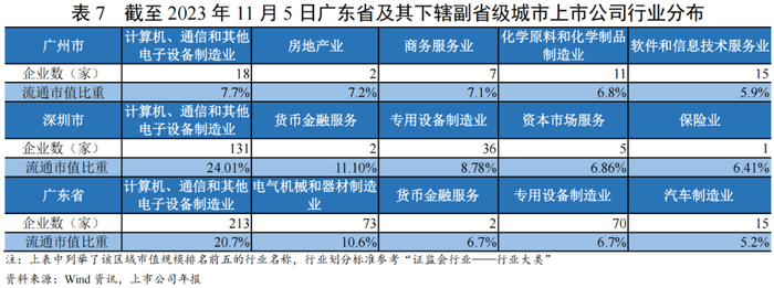 广州市注册的A股上市企业覆盖41个行业[3],市值规模位居前五的行业依次为计算机/通信和其他电子设备制造、房地产、商业服务业、化学原料和化学制品制造业、软件和信息技术服务业;广州市前五大行业集中度(按流通市值计)以及金融/资本市场行业比重(按流通市值计)均低于深圳市。综合广东省全省以及广州市、深圳市各自的市值分布看,计算机、通信和其他电子设备制造业在广东省上市企业具备一定支柱作用,省内企业及市值主要集中于深圳市,有望带动省内相关产业生态的建立、提升相关产业的整体竞争力;此外,广东省市值比重较高的电气机械、汽车制造等产业未出现在广州市和深圳市的前五大行业中,广州市市值比重较高的房地产、化学原料和化学制品制造行业未出现在广东省和深圳市的前五大行业中,则计算机和通信制造之外的产业可能具备一定区域分散性。