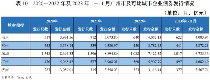 2020-2022年,广东省企业债券[4](合计)发行规模波动回落(复合变动率为-2.21%),可比省份发行规模均为波动上升,其中广州市和3个可比省会城市发行规模均为波动上升(其中广州市复合变动率为7.96%),深圳市则波动回落;2023年1-11月,广东省发行规模同比下降7.00%,其中广州、深圳发行规模均低于上年同期,可比省份发行规模同比变动率为14.18%~26.17%,其省会城市发行规模均高于上年同期。广州市及可比城市在省内经济地位重要,以2022年为例,广州市及可比城市债券融资规模占全省债券融资规模的25%~50%(广州市占比约39%),其中南京比重偏低、深圳市比重最高。