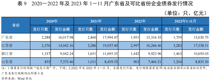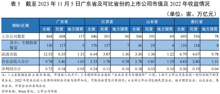 截至2023年11月5日,广东省内A股上市公司共计868家(含18家ST或*ST企业),按前一交易日收盘价计算的流通市值合计12.53万亿元,明显高于可比省份;此外,广东省和浙江省各有一家在港股上市、市值超万亿的民营上市公司[2],广东省在上市企业资源方面优势显著。