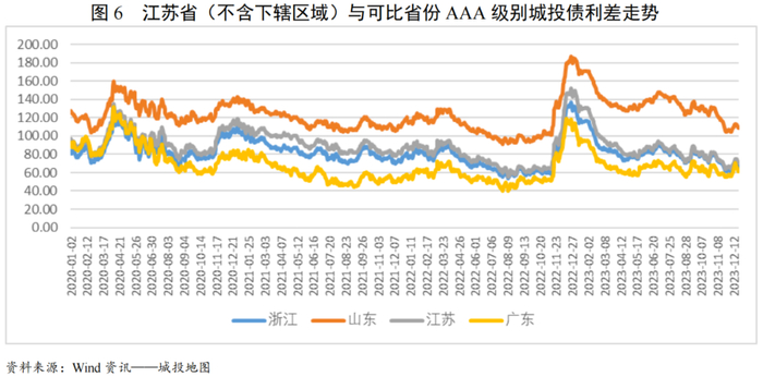 利差方面,根据Wind城投债利差数据,2020-2022年底,浙江省、山东省、江苏省与广东省(不含下辖区域)AAA级别城投债利差均呈现先降后升的变化趋势;受超预期因素及债券市场供需变化等宏观因素影响,2022年底利差陡然上升,至2023年2月初达到高位后开始缓慢回落,但整体仍高于2022年下半年水平,利差走势大体与国债收益率走势一致。可比省份中,山东省利差高于其余三省,差异在50~80bps左右;江苏省与浙江省利差接近,差异保持在10~20bps;广东省利差略低于江苏省、浙江省,差异在0~20bps左右。