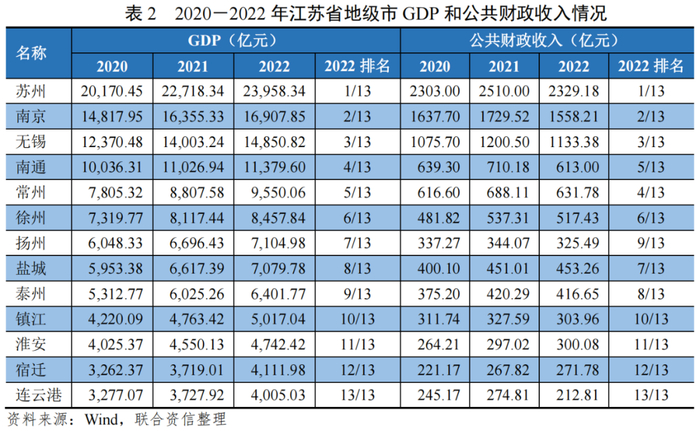 江苏省按区域地理位置分为苏南五市(南京市、苏州市、无锡市、常州市、镇江市)、苏中三市(南通市、扬州市、泰州市)和苏北五市(徐州市、连云港市、淮安市、盐城市、宿迁市)。江苏省下辖地级市整体发展质量非常高,经济发展相对比较均衡。2022年,江苏省下辖13个地级市均进入全国GDP百强城市,其中4个万亿GDP城市(苏州市、南京市、无锡市、南通市),2个8000-10000亿城市(常州市、徐州市),4个5000-7000亿级城市(扬州市、盐城市、泰州市、镇江市,其中镇江市在2022年GDP首次突破5000亿元),3个4000亿级城市(淮安市、宿迁市、连云港市)。此外,苏锡常城市也将成为全国唯一一个全部突破万亿GDP的地级城市群,整体发展质量非常高。相对而言,江苏省内整体经济实力呈现“南强北弱”的格局,苏南地区整体经济发展水平相对更高,系省内经济发展引擎,苏北地区与苏南地区经济规模有一定差异。公共财政收入所呈现的序列与GDP大体一致。