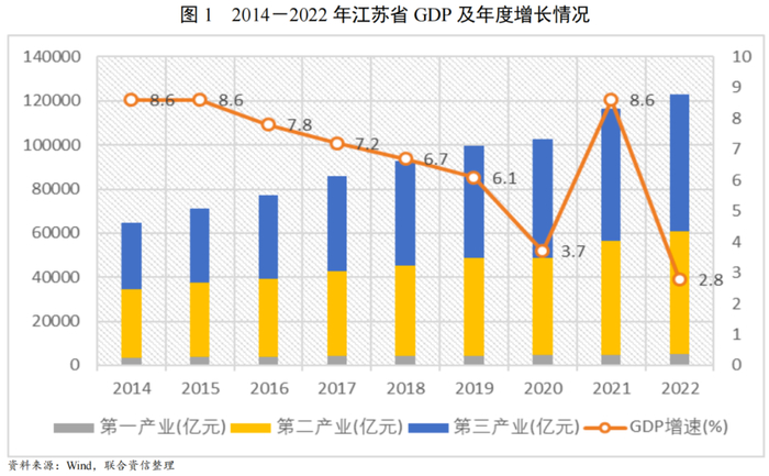 2022年,江苏省经济持续发展,全年社会生产总值迈上12万亿,经济总量稳居全国第二位(仅次于广东省),三大产业结构持续优化,经济活力不断增强。江苏省具备较为完备的产业结构,工业体系格局以化工、机械、汽车、纺织及电子信息产业为主导,先进制造业增势良好。