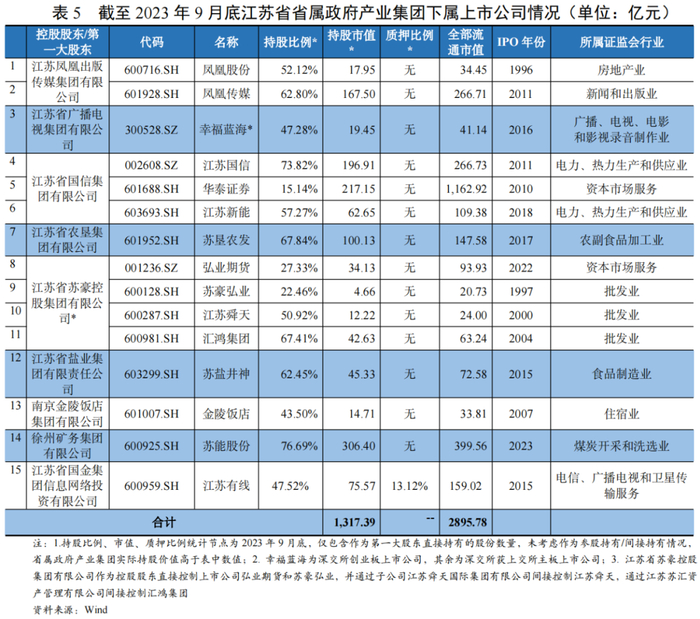 截至2023年9月底,江苏省国资委、省政府实际控制上市公司合计19家,其中江苏省省属政府产业集团下属上市公司合计15家(含主板14家、创业板1家),2023年3月新增一家IPO上市公司(为徐州矿务集团有限公司下属苏能股份)。上市公司流通市值合计2895.78亿元,其中省属政府产业集团作为第一大股东直接和间接持有的上市公司市值合计1317.39亿元,且除江苏有线外大部分流通股份均未用于质押,包括华泰证券在内的股权质量和流动性良好。