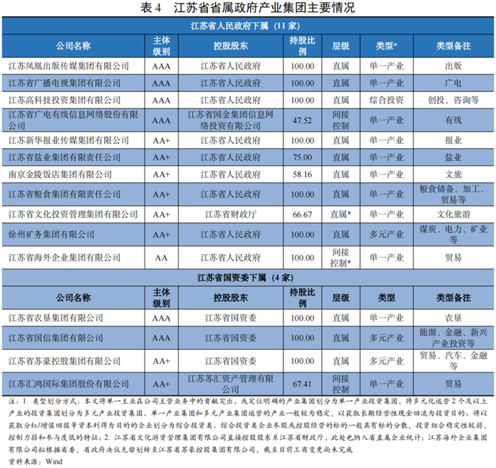 其中,江苏省人民政府下属产业集团共11家,从主体级别来看,包括AAA企业4家、AA+企业6家、AA企业1家;从类型上看,以专业化运营单一产业的企业为主,涉及贸易、出版、广电、有线、报业、盐业、文旅等传统行业,有综合投资类企业1家(为江苏高科技投资集团有限公司),多元产业集团1家(徐州矿物集团有限公司)。江苏省国资委下属产业集团4家,从主体级别来看,包括AAA企业2家和AA+企业2家,类型上包括单一产业集团2家和多元化投资产业集团2家,其中江苏汇鸿国际集团股份有限公司是江苏省苏豪控股集团有限公司下属子公司。