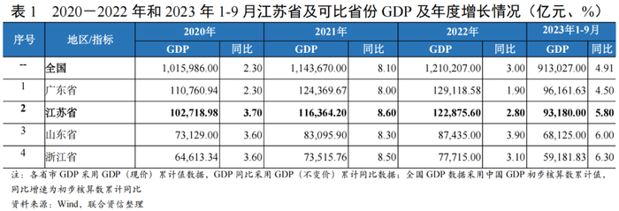 2022年,江苏省实现国内生产总值(GDP)122875.60亿元,稳居全国31个省/直辖市/自治区中的第二位(仅次于广东省),迈上12万亿元新台阶,GDP总量占全国经济总量的10.15%;增速方面,2021年受上一年的低基数影响全国GDP增速均处于高位,至2022年江苏省GDP同比增速回落至2.80%,略低于全国GDP同比增速。2023年1-9月,江苏省实现国内生产总值93180.00亿元,同比增速为5.80%,领先全国增速0.89个百分点。